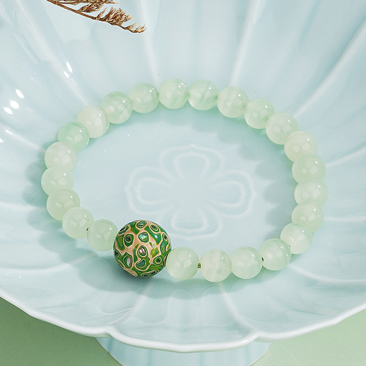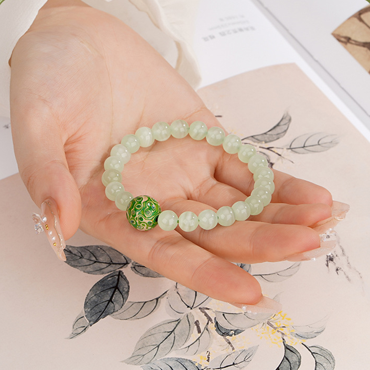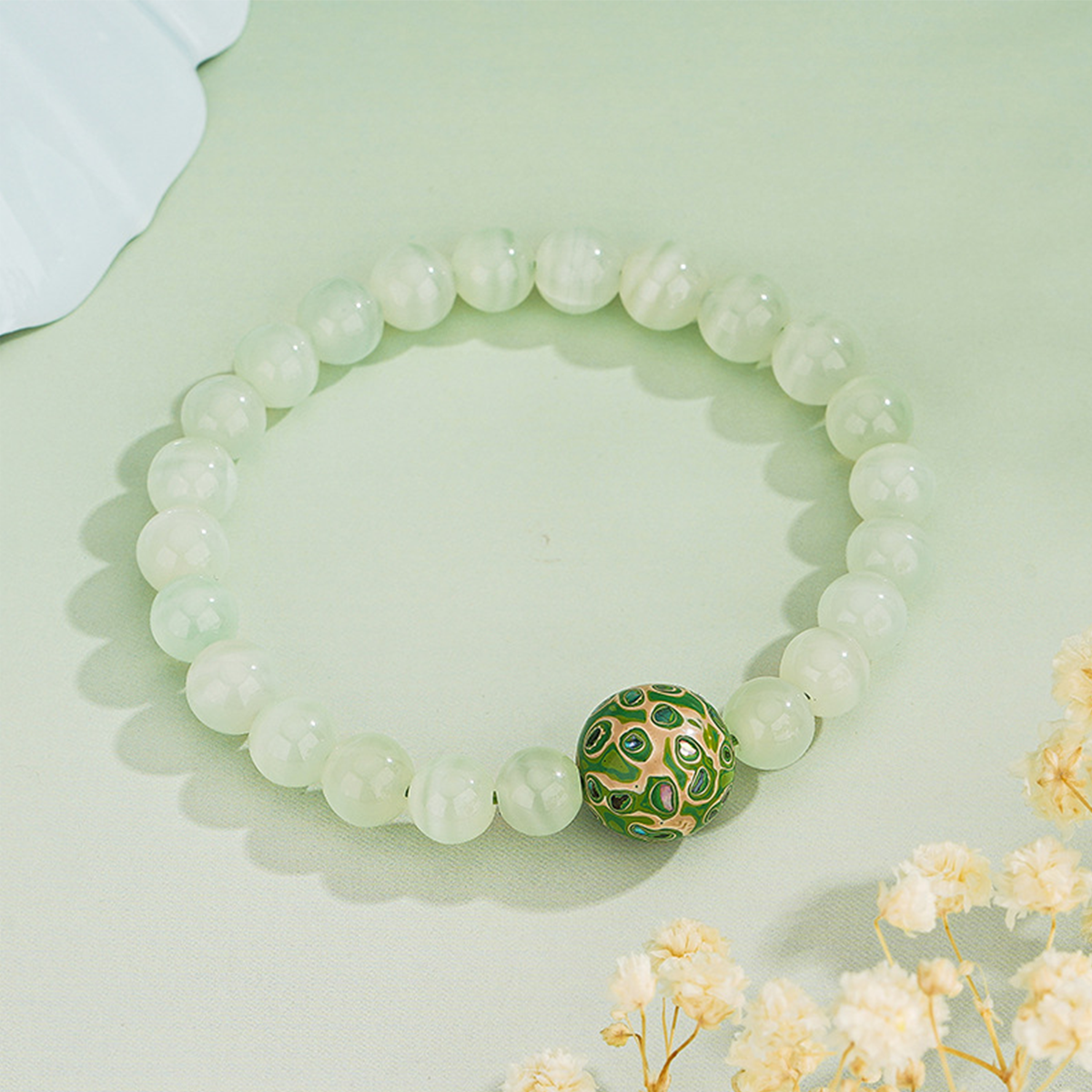 “Green Dew & Companion Bead” bracelet is crafted with jade of clear luster like morning dew and warm texture like fine nephrite. Each round bead is luminous and plump—its delicate, cool touch feels like morning dew gently brushing the skin, carrying an inherent healing power that soothes the mind.