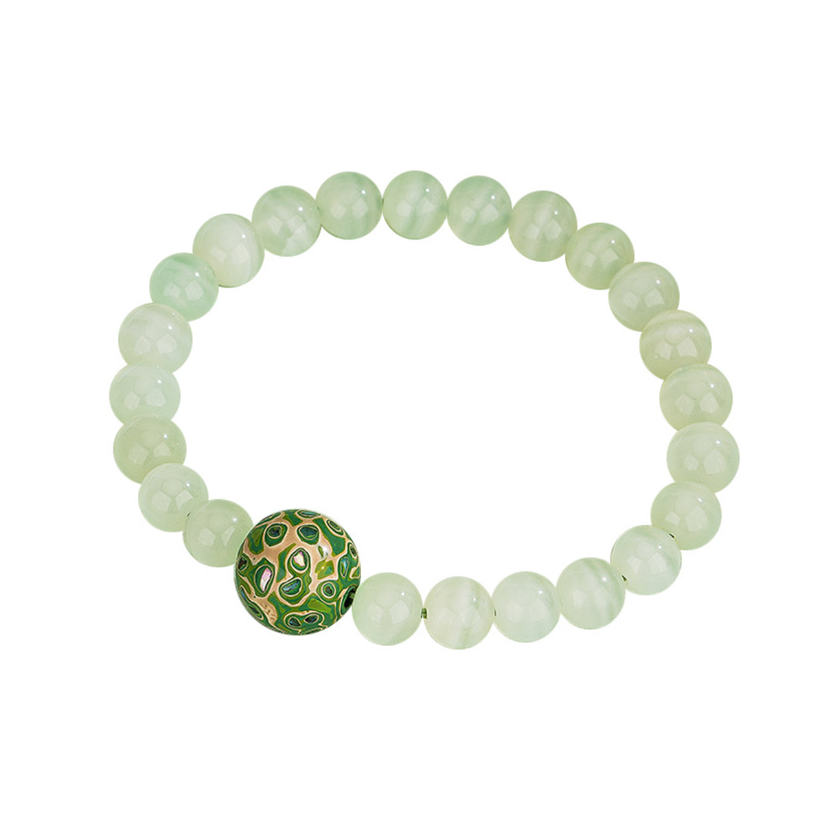 Among the beads, a meticulously crafted large accent bead stands out: its grains like soft marks carved by time, and its blended hues seem to hold a quiet promise of “constant companionship.” It’s as if this bead adds a warm footnote to the jade’s “morning dew world”—a note of “always being here, bringing peace of mind.”