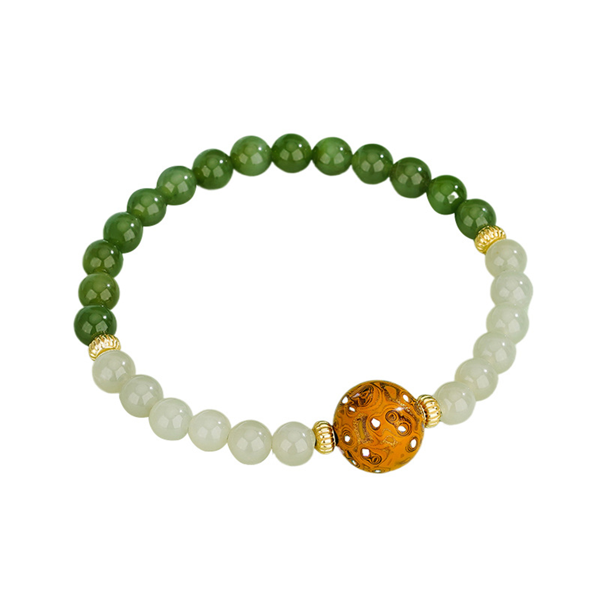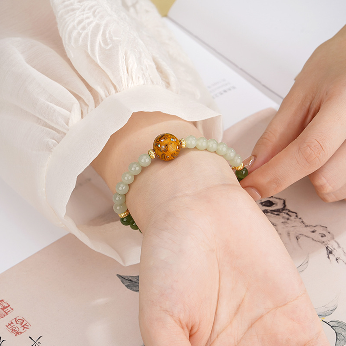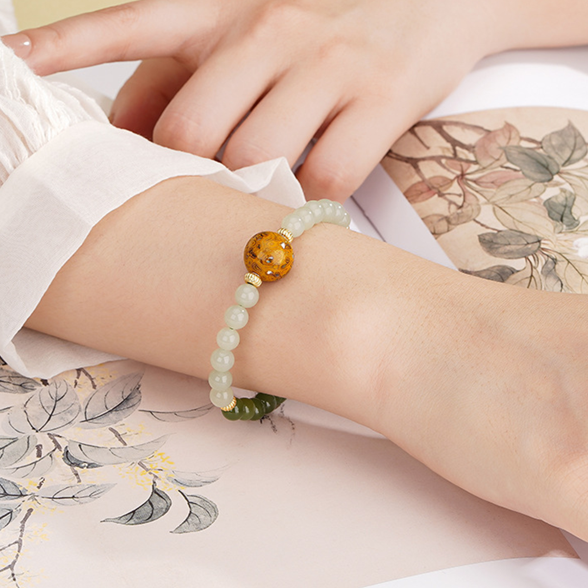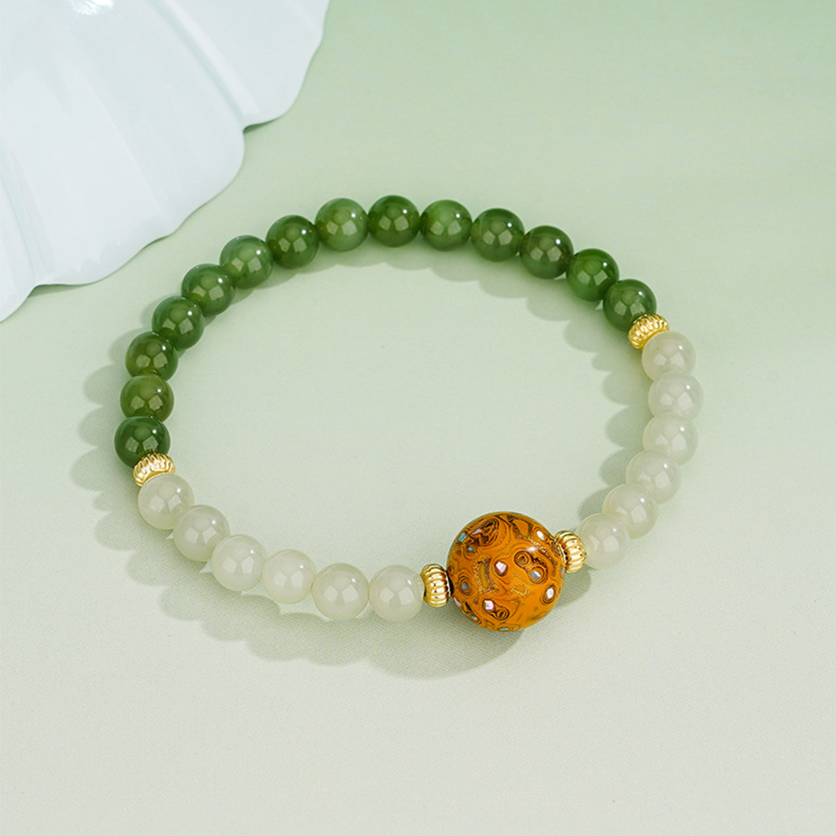 “Jade & Moonlight, Gold & Rosewood · Twin Glow” bracelet is crafted with care, featuring lush, luminous green jade and translucent white jade that shimmers like moonlight. Each green jade bead is plump and vibrant, its luster mirroring the passionate affection in a lover’s eyes; the white jade boasts a fine, cool texture, soft as the sincere, tender sincerity shared between two hearts.